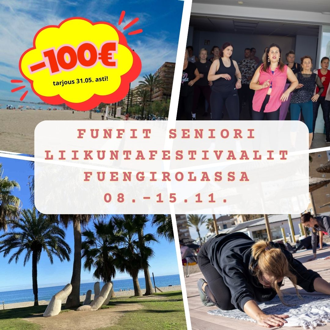 Matkan aikana ehdit nauttimaan Fuengirolan upeasta, yli kahdeksan kilometriä pitkästä hiekkarannasta ja rantabulevardista, tutustua kaupunkiin ja lähialueeseen joko itsenäisesti tai retkillä ja osallistumaan FunFit Senior liikuntafestivaaleille! Ohjelma on tehty kaikille sopivaksi, et tarvitse mitään ennakko-osaamista! Valitse itsellesi sopivat treenit tai osallistu kaikkiin!