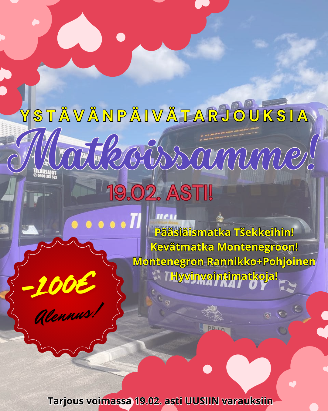 Hyvää Ystävänpäivää! Ystävyyden kunniaksi tarjoamme matkojamme alehintaan! Varaa 19.02. mennessä